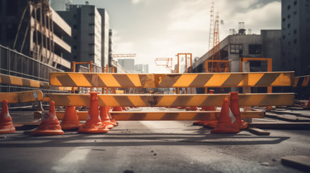 live view of road being repaired with fresh asphalt, traffic cones and barriers in place, created with generative ai