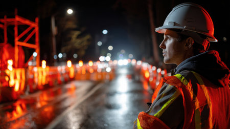 A man in a reflective vest stands on a wet road at night. He is wearing a hard hat and is looking at something in the distance
