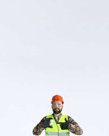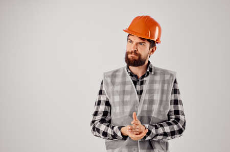 a man builder is dressed in special clothes and an orange hard hat stands near a white wall. Copy space