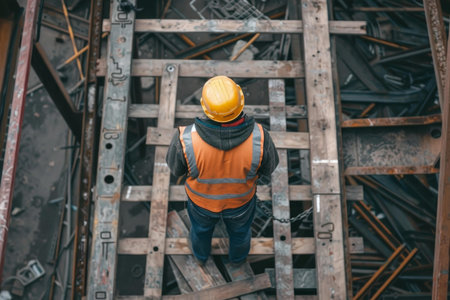 Highangle view of a construction worker in safety gear observing a construction site