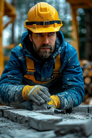 Skilled construction worker expertly laying bricks outdoors, highlighting craftsmanship in sunlight
