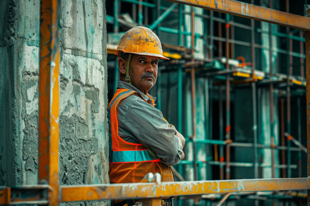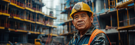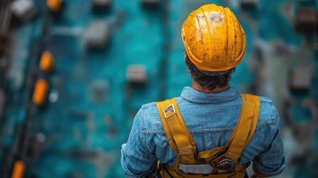 Portrait of a construction worker in yellow helmet, showing dedication, strength, and industrial resilience.