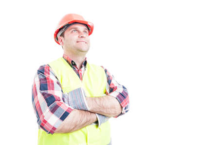Confident smiling and trustworthy builder posing with arms crossed isolated on white background with advertising area