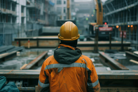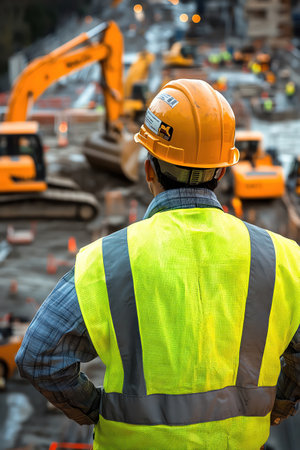 A construction supervisor in reflective gear stands overlooking a busy worksite with heavy machinery in operation, indicating progress and management