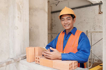 Serious Vietnamese builder in hardhat taking orange bricks from pile on construction site