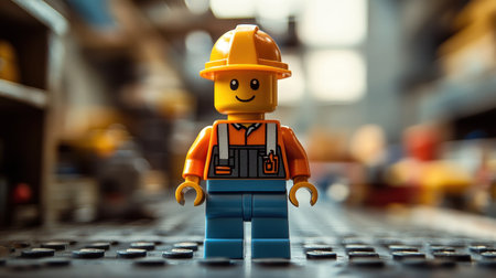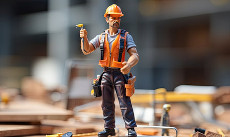 A brightly colored construction worker figurine with a smiling face and a yellow hard hat is featured prominently in a bustling workshop. The figure dressed in orange and blue embodies the spirit of the construction industry. The background is filled with various tools equipment and materials emphasizing an active work environment