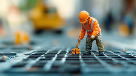 A tiny construction worker clad in an orange hard hat and reflective vest diligently measures a grid layout on the ground at an urban construction site. The worker is focused on ensuring precision as machinery looms in the background