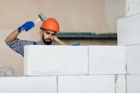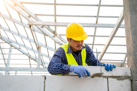 bricklayer builder working with autoclaved aerated concrete blocks. Walling, installing bricks on construction site