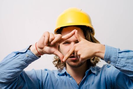 Engineer with a beard in glasses and a helmet on a yellow background, emotions.