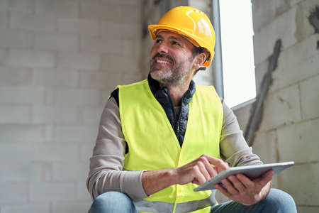 Caucasian engineer sitting on stairs and browsing digital tablet on construction site