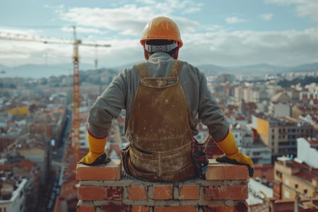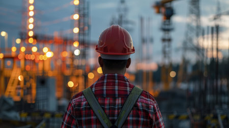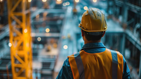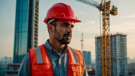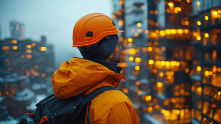 A construction worker in a yellow hard hat gazes over a city skyline, symbolizing urban development, labor, and progress.