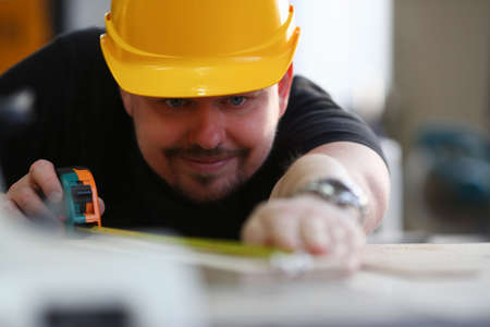 Man builder in helmet makes measurements with tape measure