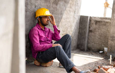 Thoughtful Worried construction labour at sitting at site - concept of job loss, debtedness and lonely.