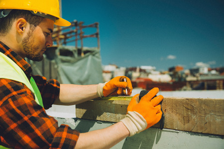 Construction worker on site, measuring wooden beam. Toned image, fine grain added