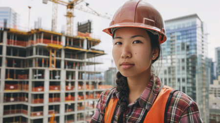 A woman wearing a hard hat and safety vest stands in front of a building. She looks serious and focused