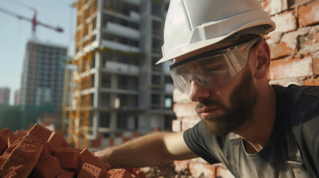 Construction worker wearing hardhat and safety glasses looking at pile of bricks