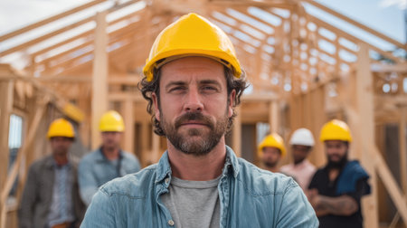 Portrait of a confident construction manager leading a team of builders on a wooden structure site with safety helmets and blue sky background