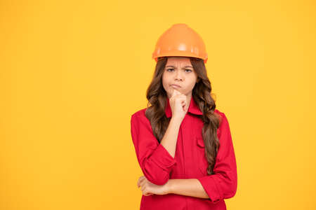 unhappy child girl in protective hard hat, copy space, problem