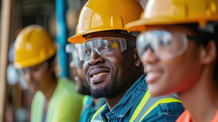 A group of multi-ethnic workers at a construction site wearing hard hats