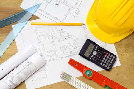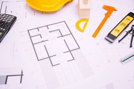 Architect desk tool working with blueprints in the office.Home Project to Offer Management.