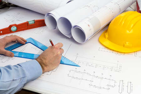 An engineer is using a tape measure to measure the plans of the house that he designs, the drafts the house drawings to build the correct standard. Engineer concept.