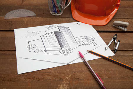 Architect sketching a construction project, view from the top