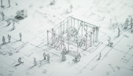 Dynamic blueprint scene with miniature builders engaged in architectural design and construction