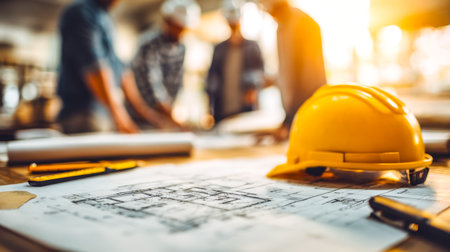 Generative AI, Blueprint floor plan architectural project on the table with yellow helmet and pencil