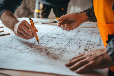 A close-up view of a professional team collaborating over architectural blueprints. Hands holding a pencil engage in discussion while planning project developments.