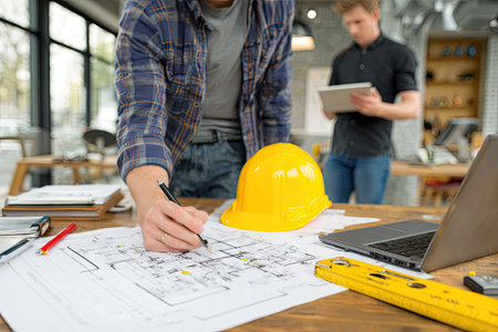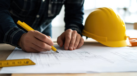 A dedicated construction worker in a yellow hard hat meticulously plans a building project using detailed blueprints and various tools in a busy workshop.