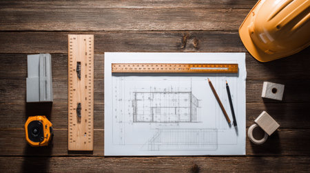 A top view of a wooden table showcasing essential construction tools, including an architectural blueprint, ruler, pencil, tape measure, and safety helmet, ideal for renovation projects.