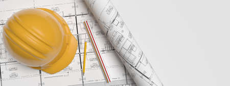 Hard hat,pencil and scale.Townhouse blueprint plan with copy space.Architect concept.3d rendering