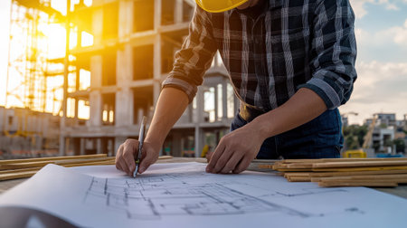 Construction professional reviewing architectural plans at a building site during daylight