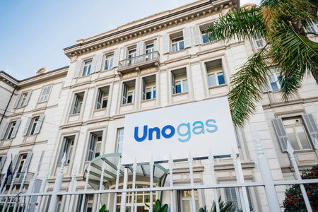 Unogas signage on the facade of the large building with palm tree in front