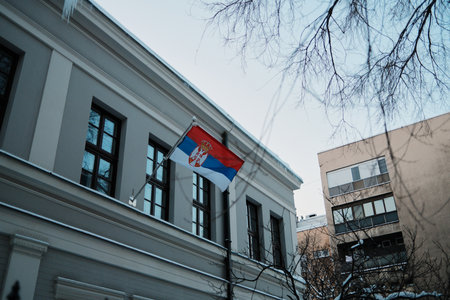 Serbian national flag displayed on historic government building during winter day. Symbol of national identity, state authority, and architectural heritage
