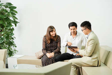 Young businessman sitting on sofa and showing online presentation on digital tablet to couple during business meeting at office