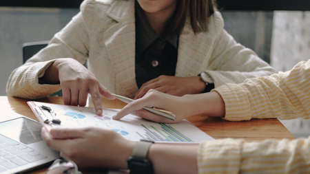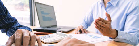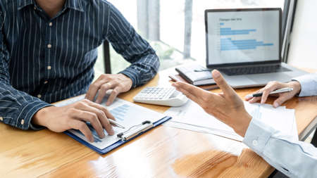 Business people discussing business strategy collaborate during discussions about financial and marketing documents, meetings, data analysis, financial graphs and in-office charts with laptops and cal