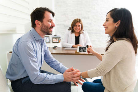 Excited pregnant couple holding the print ultrasound of their baby while sitting with their female gynecologist at her desk. Happy pregnant woman and man just found out the sex of their baby