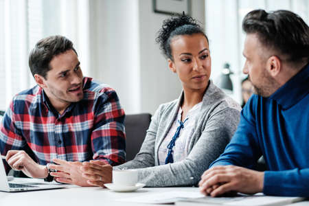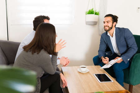 Handsome finance advisor having a meeting with clients at their home to talk about investment plans