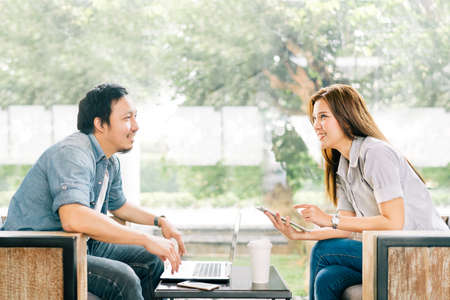 Young Asian couple or coworker talking at coffee shop or modern office, garden background. With laptop notebook, smartphone and digital tablet. Modern lifestyle with computer gadget technology concept