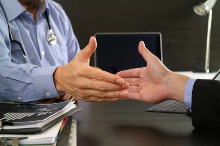 Medical and health care concept,Doctor and patient shaking hands in modern office at hospital