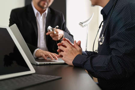 Medical doctor in white uniform gown coat consulting businessman patient having exam as Hospital professionalism concept