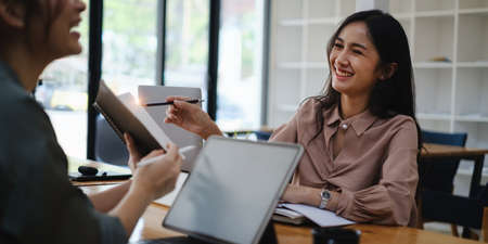 Coworker business concept, Two businesswoman point on document to discussing new project together.