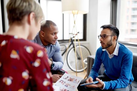 Group of young creative coworkers brainstorming and discussing new startup project together in office.