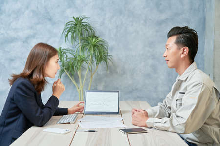 The home insurance salesperson is explaining the details of the policy and the benefits that can be obtained when agreeing to purchase insurance with his company. Home insurance concept.