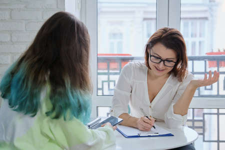 Female psychologist talking with teenage girl 15, 16 years old. Teenager telling and showing on smartphone problems. Mental health of youth, adolescence