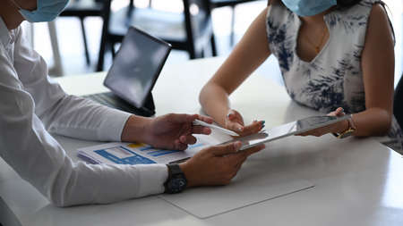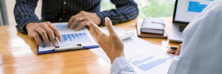 Business casual manager presenting and discussing company growth project success financial statistics, professional investor working start up project for strategy plan with document.