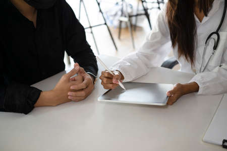Female doctor explaining about the treatment on digital tablet for man patient.