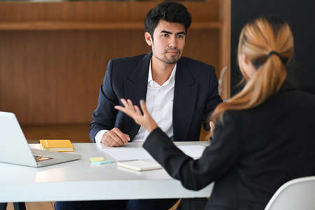 Attentive businessman listening to business partner talking during negotiations at meeting in office.