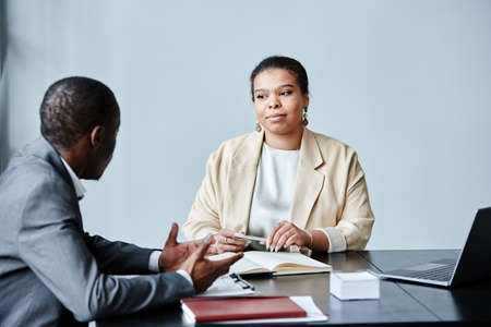 Minimal portrait of young African American businesswoman leading meeting with client or partner in office